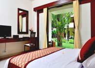 amongst the luxuriant gardens. Each bungalow features a large wooden