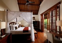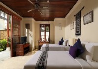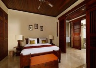 Occupying the entire upper floor, the enormous master bedroom showcases a four-poster queen bed, a tall thatched roofing, a massive bathroom with a separate bath area where a walled-in bathtub sits, and an extended balcony overlooking the stunning pool courtyard below. The two bedrooms on the ground floor directly access the garden courtyard, one is equipped with a double bed, the other a twin. Both have large en-suites with a semi-open outdoor shower area. All three bedrooms have spacious built-in wardrobe and dresser. The wooden-timber dominant interior design gives way to a cool ambience, well contrasted by giant glass doors and windows letting in plenty of sunrays and fresh air at all times. All bathrooms are equipped with luxury-resort-style amenities.